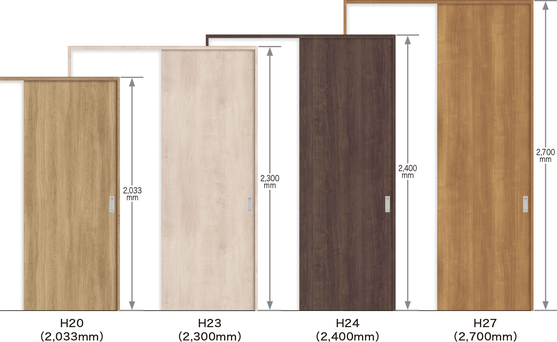 ドア、引戸ともに「一般的なH20」「天井近くまでの高さのH23」「天井高まである豪華なH24」「天井高が2,700mmを超えるお部屋には開放感を演出するH27」の4種をご用意。特長
